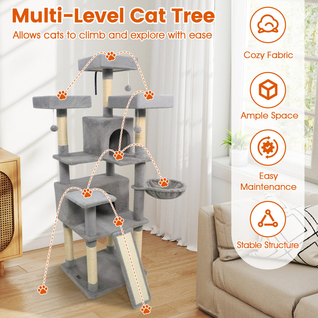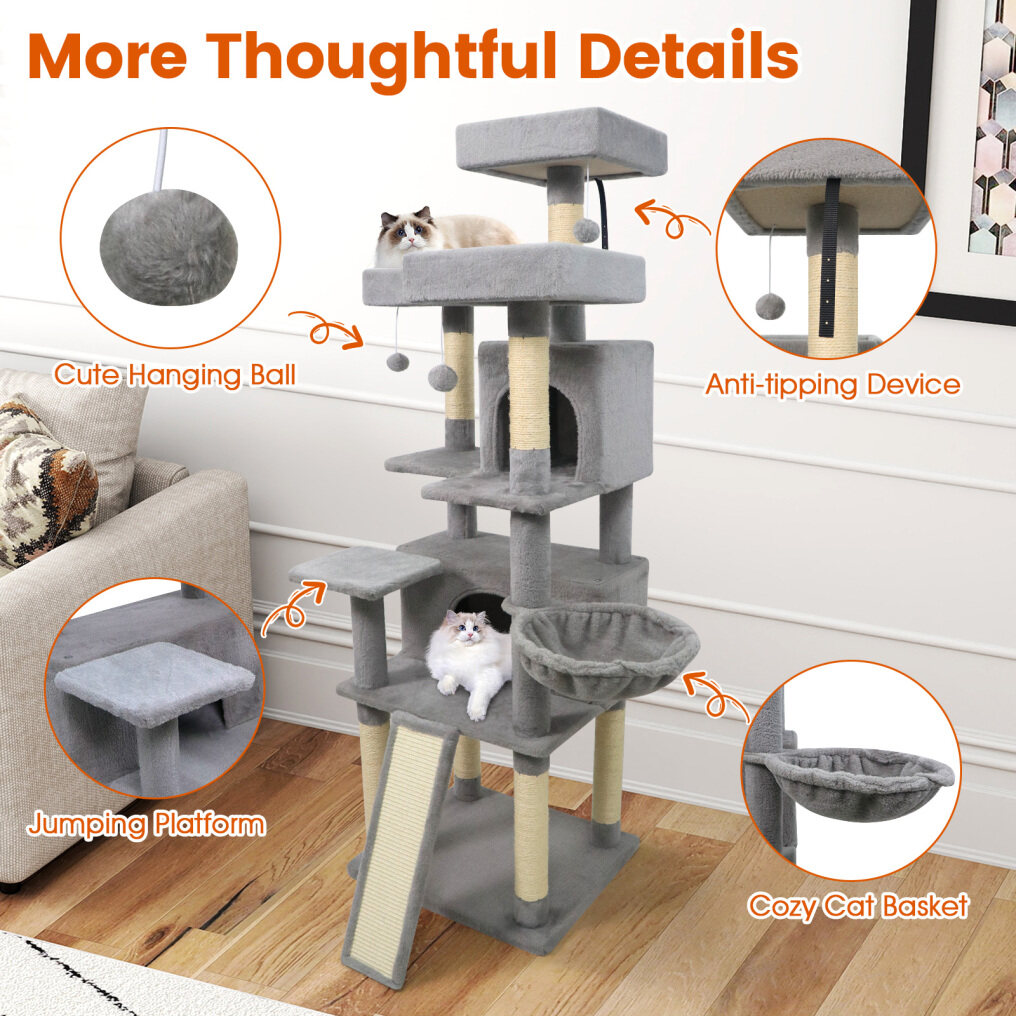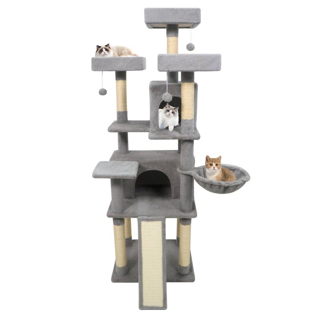 ● Satisfy Cat's Scratching Instinct: The tall cat tree features wear-resistant scratching posts, perfect for releasing your cat's natural scratching instincts. Plus, the ladder with a scratching board provides more space for cats to grind their claws.