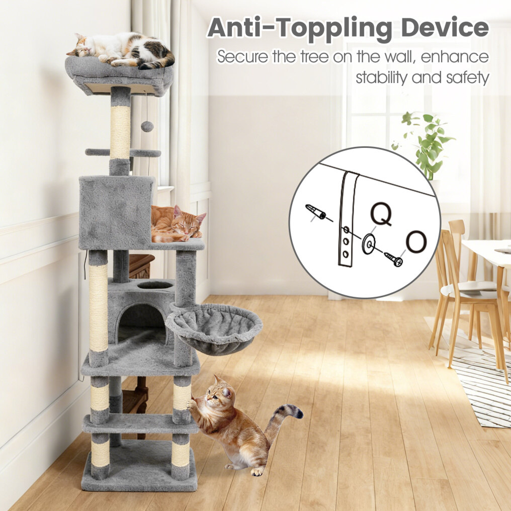 ● Multiple Resting Spots for Relaxation: This tall cat tree features 2 cozy top perches, 2 spacious cat condos, a soft hammock, and a comfortable basket - providing a variety of relaxing and private spaces for your cats. Each spot is thoughtfully designed to cater to cats' needs for napping, lounging, and observing their surroundings.