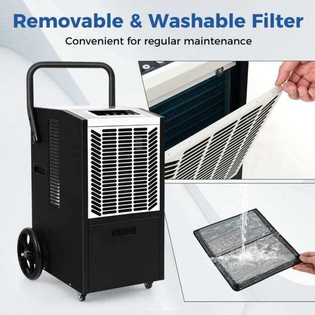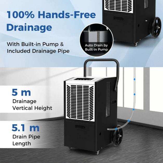 Flexible Movement and Portable Design: This industrial dehumidifier is designed with a push-pull handle, 2 lockable universal front wheels and 2 large rear wheels for effortless transportation. Plus, the built-in handles on both sides make it convenient to move the dehumidifier up and down stairs.