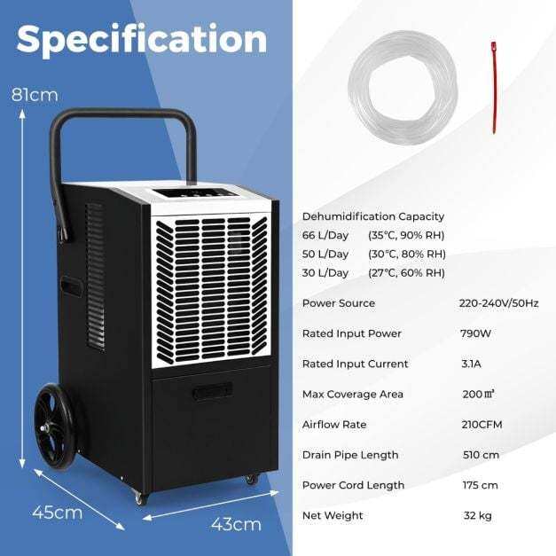 66 L/Day Commercial Dehumidifier with Pump and Drain Hose for Basement Warehouse Job Site66 L/Day Commercial Dehumidifier with Pump and Drain Hose for Basement Warehouse Job Site66 L/Day Commercial Dehumidifier with Pump and Drain Hose for Basement Warehouse Job Site