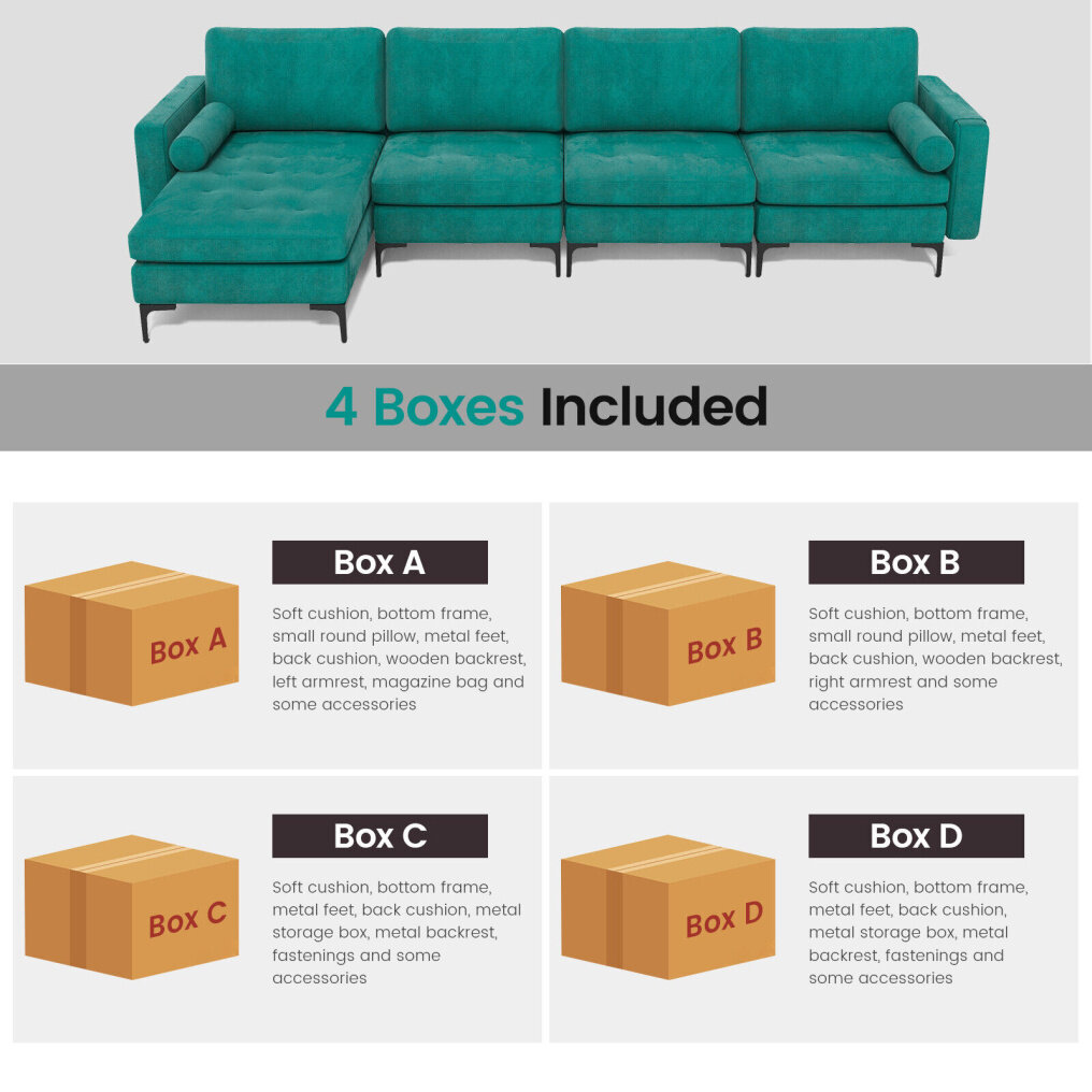 Covered with peacock blue suede fabric, this modular sofa couch is padded with high-quality sponge to ensure utmost comfort. Distributed elasticity system keeps the spring strong and durable. Besides, it features soft back pillow, thick seat cushion and side bolster. What’s more, side pocket offers extra storage. Each seat can hold up to 660 lbs, which can well support kids and adults. Solid frame, metal legs and anti-skid foot pads keep it durable and sturdy. With the modular sofa couch, you can comfortably and safely watch TV, read books, study or work.