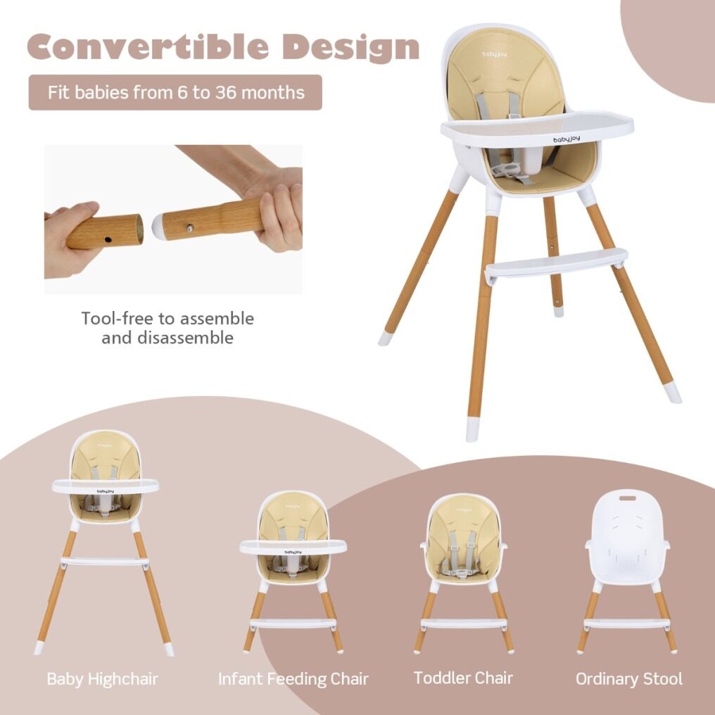 Our convertible baby high chair will be a great companion during the growth of your kids. The positions of the tray and safety harness are adjustable while kids growing up, suitable for kids aged 3-36 months. In addition, the bottom legs and tray can be easily removed requiring no tools. So you are allowed to turn this baby high chair into the shape you want to meet your personal needs in various situations, such as feeding, independent eating and playing with toys. The seat cushion is also removable and waterproof for convenient cleaning. The baby-feeding high chair is made of premium PP and PU material that is harmless to the health of babies. And the steel legs are shaped in a stable triangular structure and the non-slip foot pads also increase the stability.