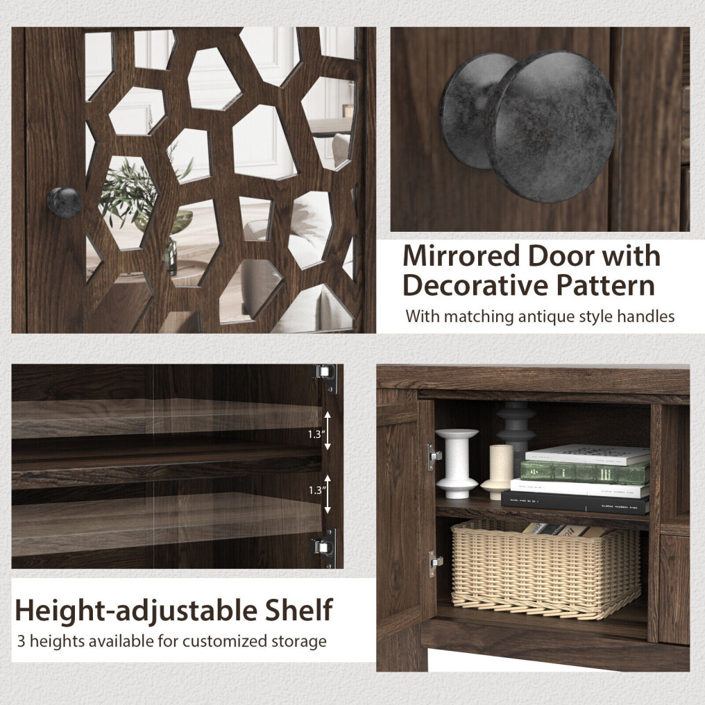 ● Retro and Elegant Appearance: The retro TV cabinet features mirrored doors with decorative pattern, together with matching antique style handles and rustic wood grain, giving a retro and elegant appeal. Meanwhile, the mirror is made of durable acrylic instead of fragile glass, thus to offer a long service life.