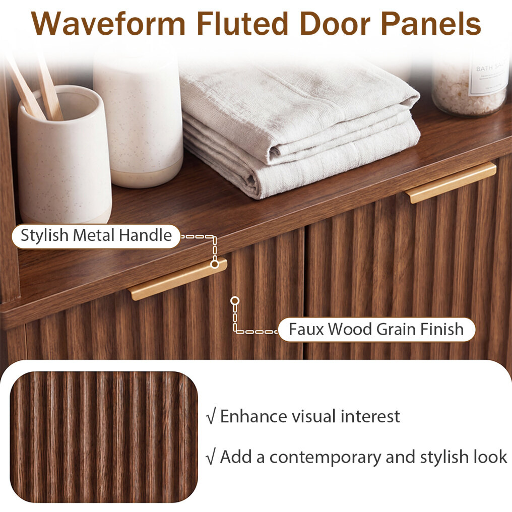 ● Elegant Details: This floor storage cabinet is built with waveform fluted door panels, stylish metal handles, and a realistic faux wood grain finish, combining modern flair with classic charm. The design enhances various decoration styles, providing a sophisticated upgrade to your home storage solutions.
