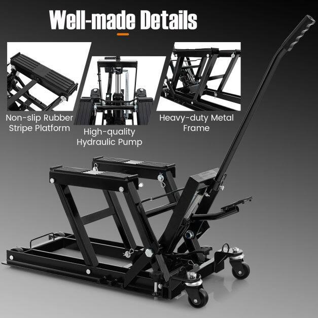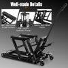 680 KG Strong Support: This motorcycle lift is engineered with reinforced metal frame, ensuring 680 kg max load. With such strong strength, the lift jack with wide and non-slip platform can accommodate most motorcycles, ATVs and dirt bikes.