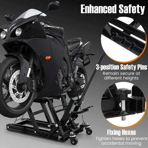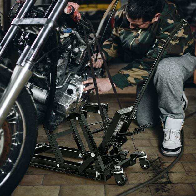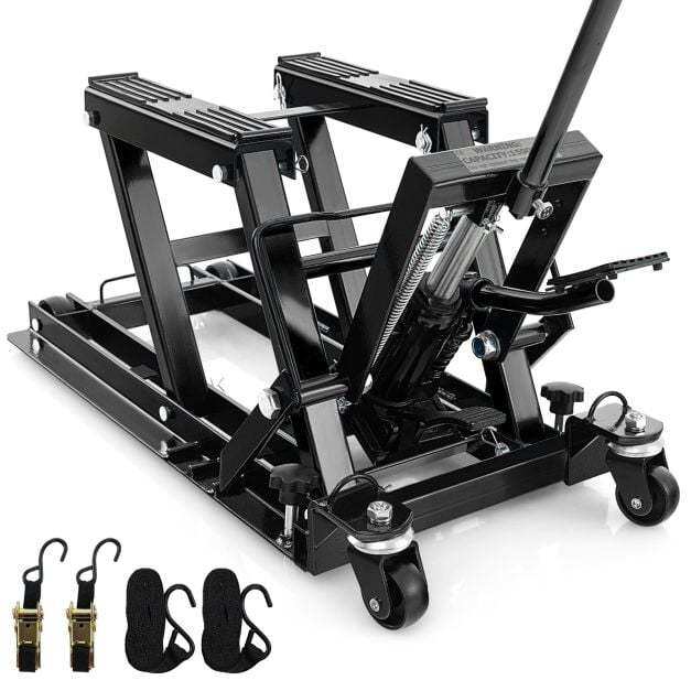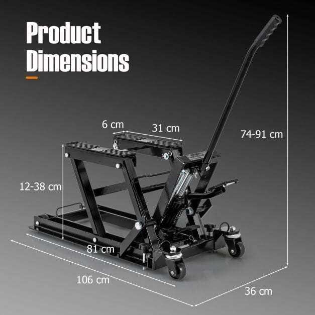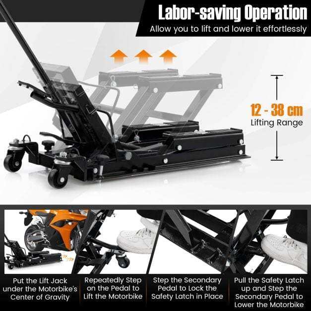 This motorcycle lift features a robust hydraulic system that allows smooth lifting from 12 to 38 cm, and a simple foot operated mechanism for straightforward raising and lowering. It also comes with 2 ratchet belts for secure fixation. The strong construction and adjustable feature make it suitable for most motorcycle models. And the wheeled base makes it easy to slide under the motorcycle. Perfect for professionals and hobbyists alike, this motorcycle lift simplifies repairs and maintenance, providing a secure and adjustable platform for motorbikes, ATVs, and dirt bikes.