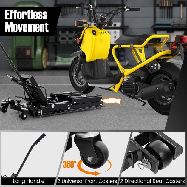 Flexible to Move: With 2 universal front wheels, 2 directional rear wheels and a long handle, you can simply control the direction and slide the motor jack under the motorcycle. Moreover, you can tighten the knob for positioning.