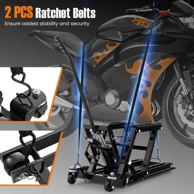 Ratchet Belt Fixation: Secure your motorcycle firmly with the 2 pcs ratchet belts included with this lift. These belts with S-shaped hooks firmly keep the motorcycle in place without wobbling, which ensures high-level security.