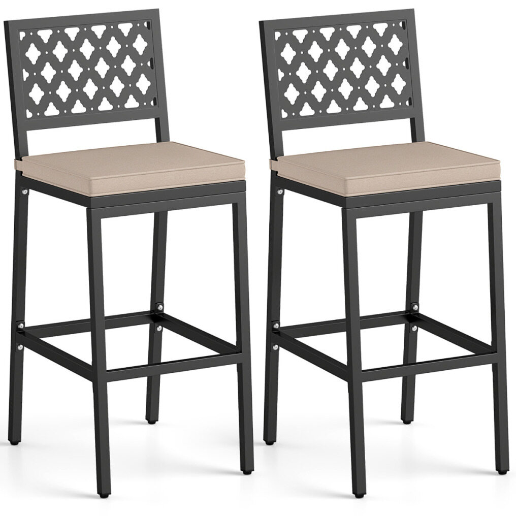 Featuring breathable diamond-shaped backrests for a chic look. Sink into the plush, easily removable5 cm cushions, wrapped in high-density sponge, ensuring each moment spent is a lap of luxury. Whether sipping cocktails by the pool or enjoying a quiet morning coffee on the deck, our heavy-duty metal construction supports up to 150 kg, guaranteeing stability and longevity. Designed for any locale from balcony to backyard, these stools measure a perfect 69 cm in seat height. Upgrade your outdoor entertainment with these exquisite bar stools, and relish in comfort that stands the test of time!