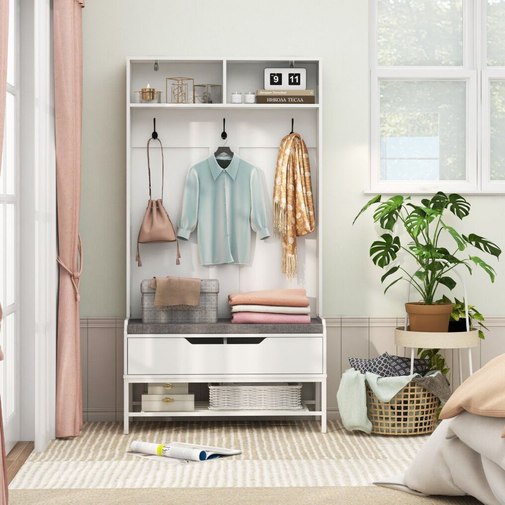 ● 4-in-1 Hall Tree: This versatile hall tree seamlessly combines the functions of a coat rack, shoe bench, shoe storage, and display shelf, making it a perfect addition to your entryway, living room, bedroom, or any other room in your home.