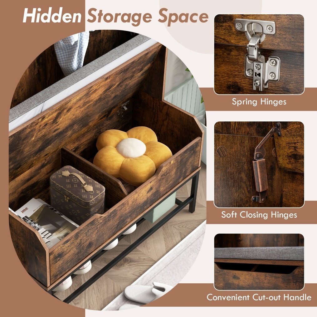 ● Hidden Storage Space: Designed with a hidden storage compartment under the seat, the 4-in-1 entryway bench helps tuck away items out of sight. The lift-up seat board makes items easily accessible, thanks to its convenient cut-out handle, spring hinges and soft closing hinges.