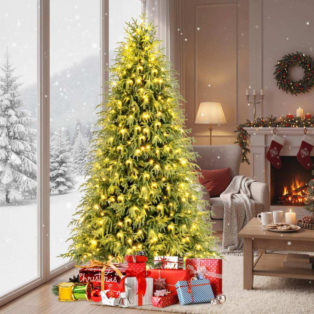 ● Luxurious Appearance: The Xmas tree is adorned with 1217/1449/1470 lush branch tips that create a deluxe and abundant look. Pre-strung with 400/500/470 warm white LED lights, this tree brings a welcoming glow to any space, creating a magical holiday atmosphere.