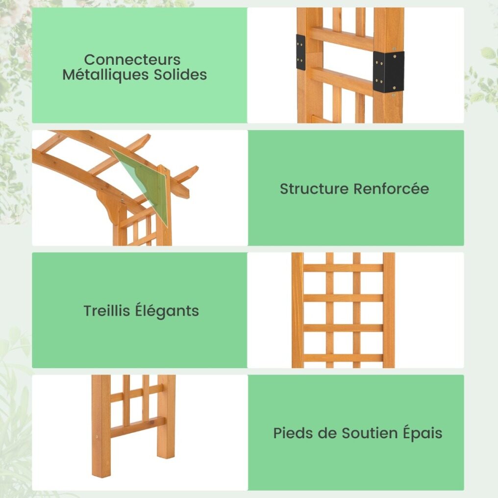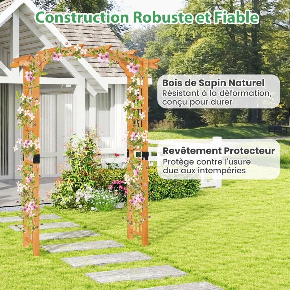 Robust and reliable construction: The garden arch, made of natural fir wood with solid metal connectors, is robust, torsion-resistant, and durable. The wooden surface is additionally coated with a protective varnish to protect it from the elements.