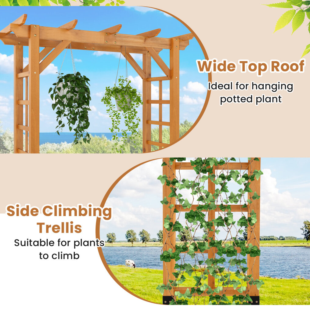 Our wooden gazebo, measuring 140 x 60 x 215 cm (L x W x H) or 160 x 60 x 229 cm (L x W x H), not only serves as a climbing pergola for vertical growth, but also provides an elegant backdrop for special occasions such as weddings and anniversaries, or simply a unique entrance to your garden or courtyard. It features a flat hanging roof or a curved hanging roof and side trellises that can be decorated with climbing plants, balloons, decorative lights, or hanging baskets for a personalized touch. Crafted from high-quality fir wood and reinforced with metal connectors, this gazebo offers a sturdy and reliable construction for long-lasting durability. Transform your outdoor space into a tranquil retreat with our wooden arch—a timeless addition that effortlessly combines functionality and aesthetics.