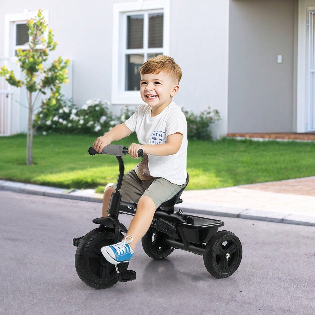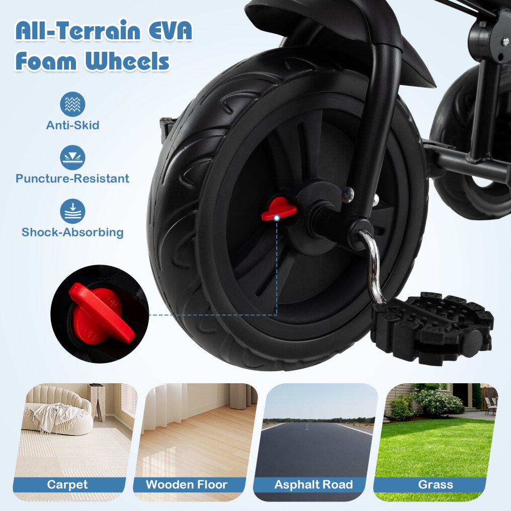● All-Terrain Riding Capability: The tricycle for toddlers boasts anti-skid, puncture-proof and shock-absorbing EVA wheels for a smooth ride across diverse surfaces such as carpet, wooden floors, asphalt roads, and grass. Thanks to the button on the front wheel, the foot pedal can be locked as needed.