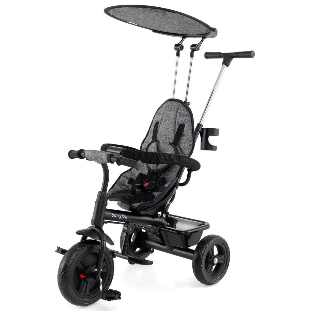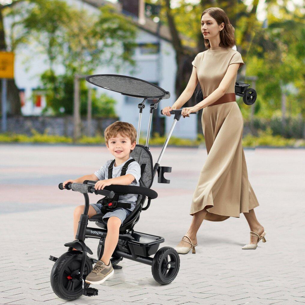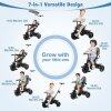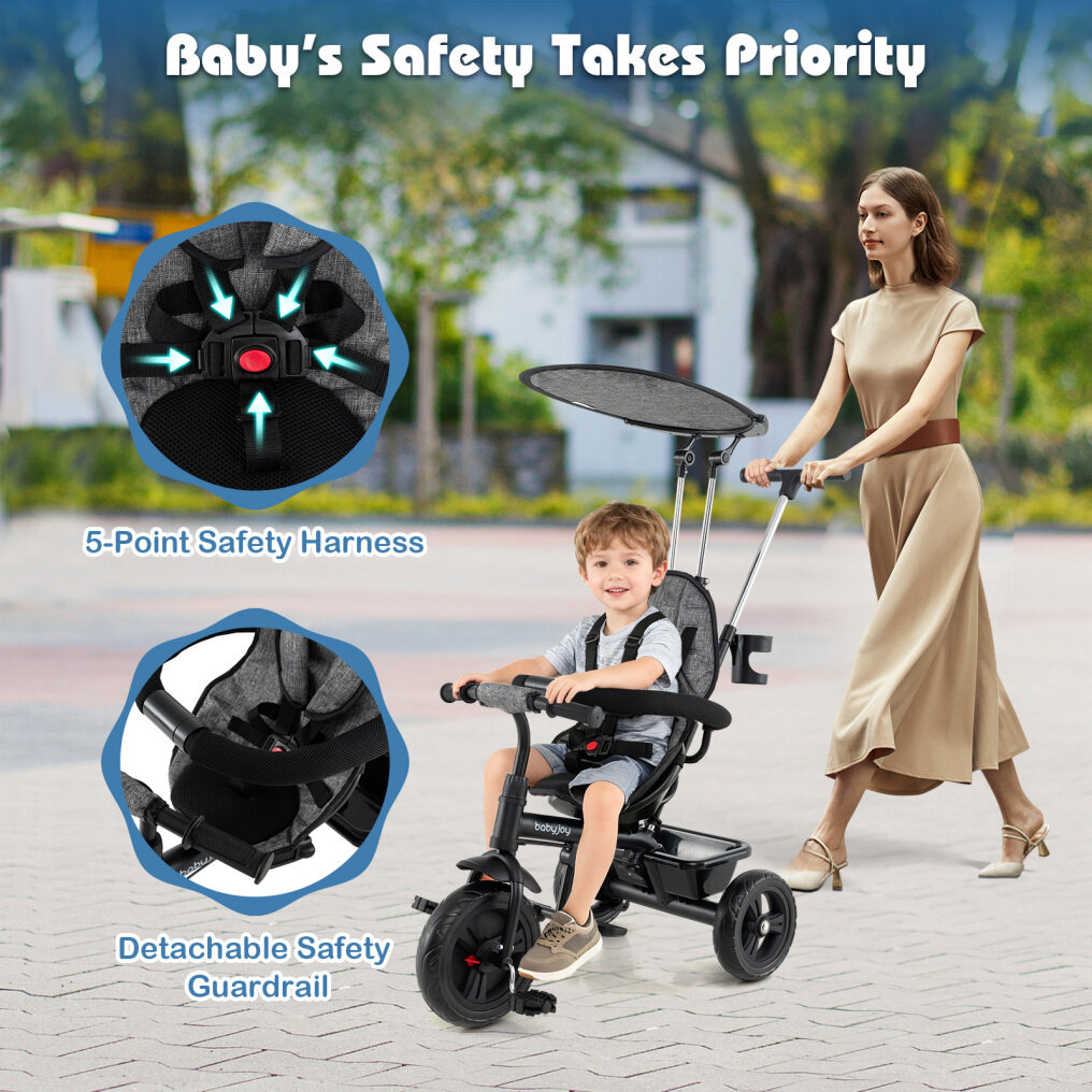 ● 7-in-1 Convertible Design: This versatile 7-in-1 push tricycle evolves alongside your growing child, featuring a detachable canopy, parent handle, backrest, guardrail, and safety harness. Supporting up to 55 lbs, the baby tricycle serves as a reliable companion for children between 9 and 60 months old.