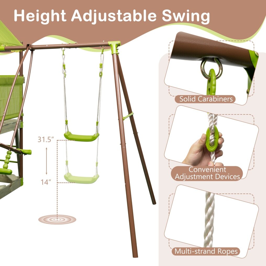 ● Kid-friendly Materials and Details: Made with BPA-free materials, the 7-in-1 swing set is safe for children. Additionally, the sun-protective polyester roof of this playset will block sunlight and keep cool. And the durable cedar wood platform has 2 entrances for easy access and 2 safety fabric nets for added security.