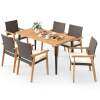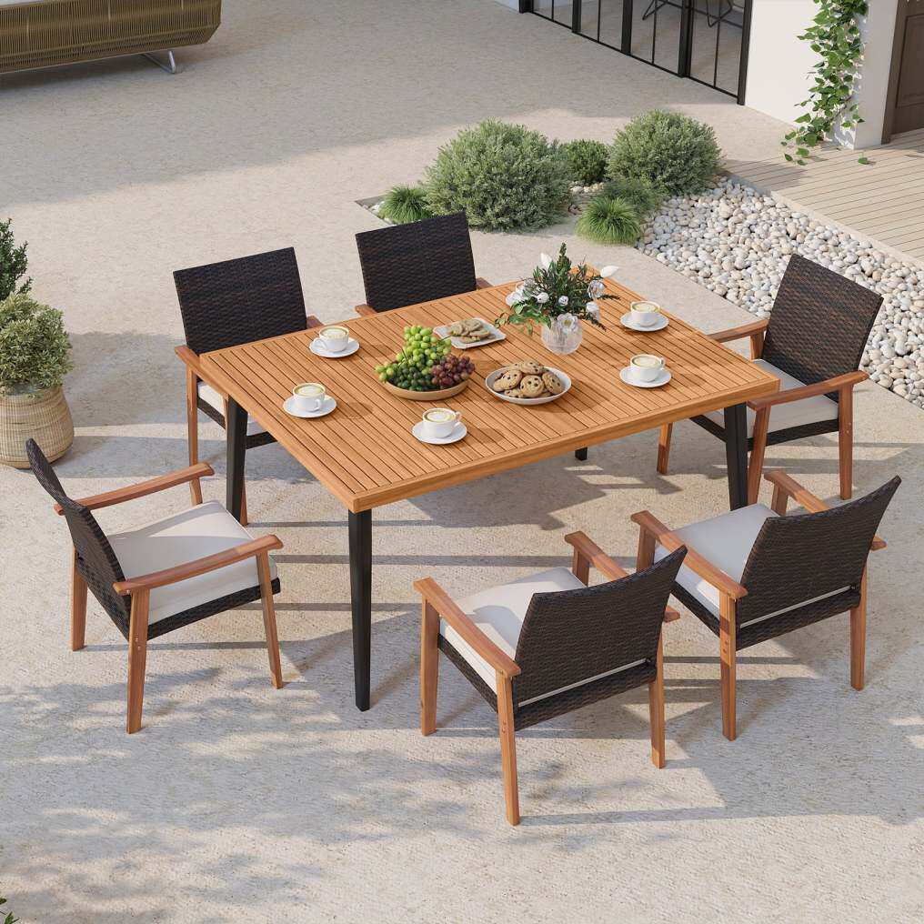 ● Versatile Dining Ensemble for 6: Featuring a spacious 63” x 32” x 29” (L x W x H) rectangular table and 6 armchairs, the outdoor dining set is ideal for accommodating up to 6 guests. It’s a great choice for family meals in the backyard or relaxed gatherings in the garden. For best durability, it’s advisable to protect the furniture from rain exposure.