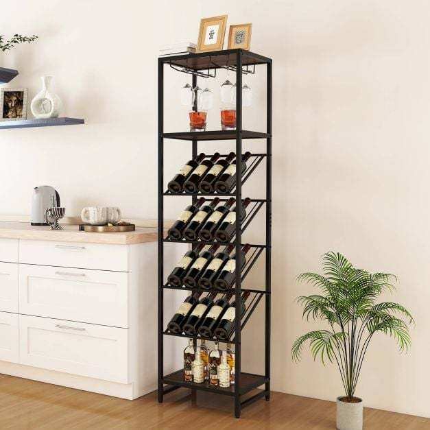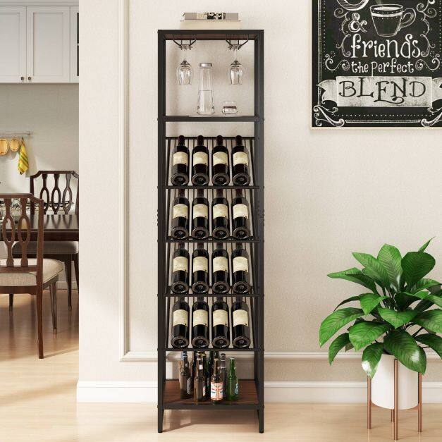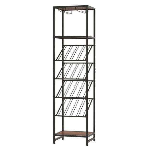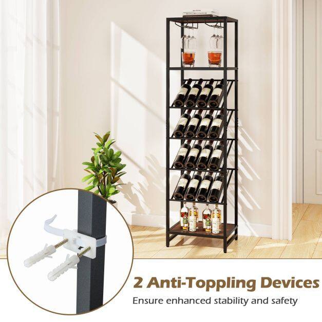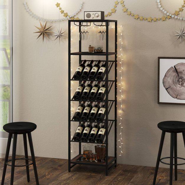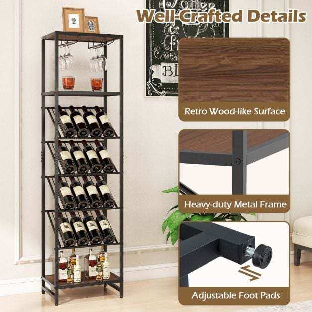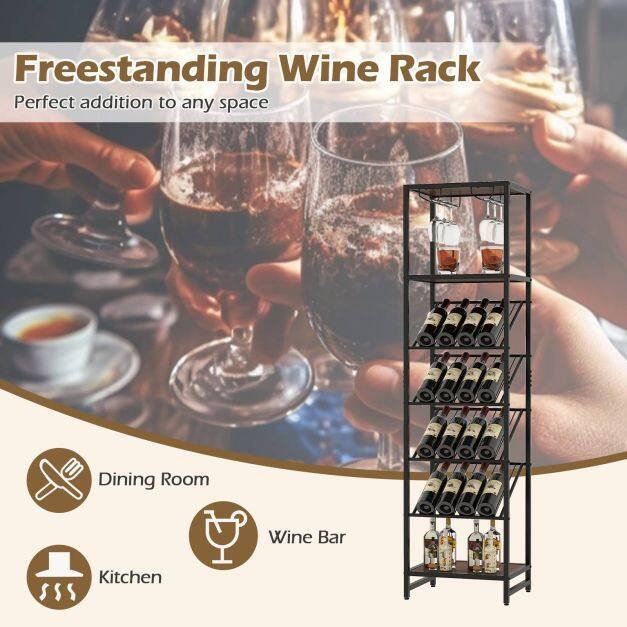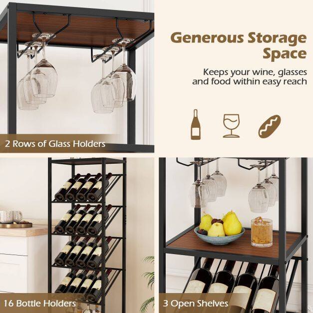 Whether you're a casual wine lover or a serious collector, the versatile wine storage stand will be your ideal choice. The floor wine stand features 4 wine racks and 3 open shelves for storing wine bottles, glasses, and other bar essentials. Additionally, 2 rows of stemware holder provide convenient storage for your glasses, keeping everything you need within easy reach. The anti-toppling design allows for excellent stability and safety. With faux wood grain surface and black frame, the metal wine rack adds a rustic charm to your home bar, dining room, or kitchen.