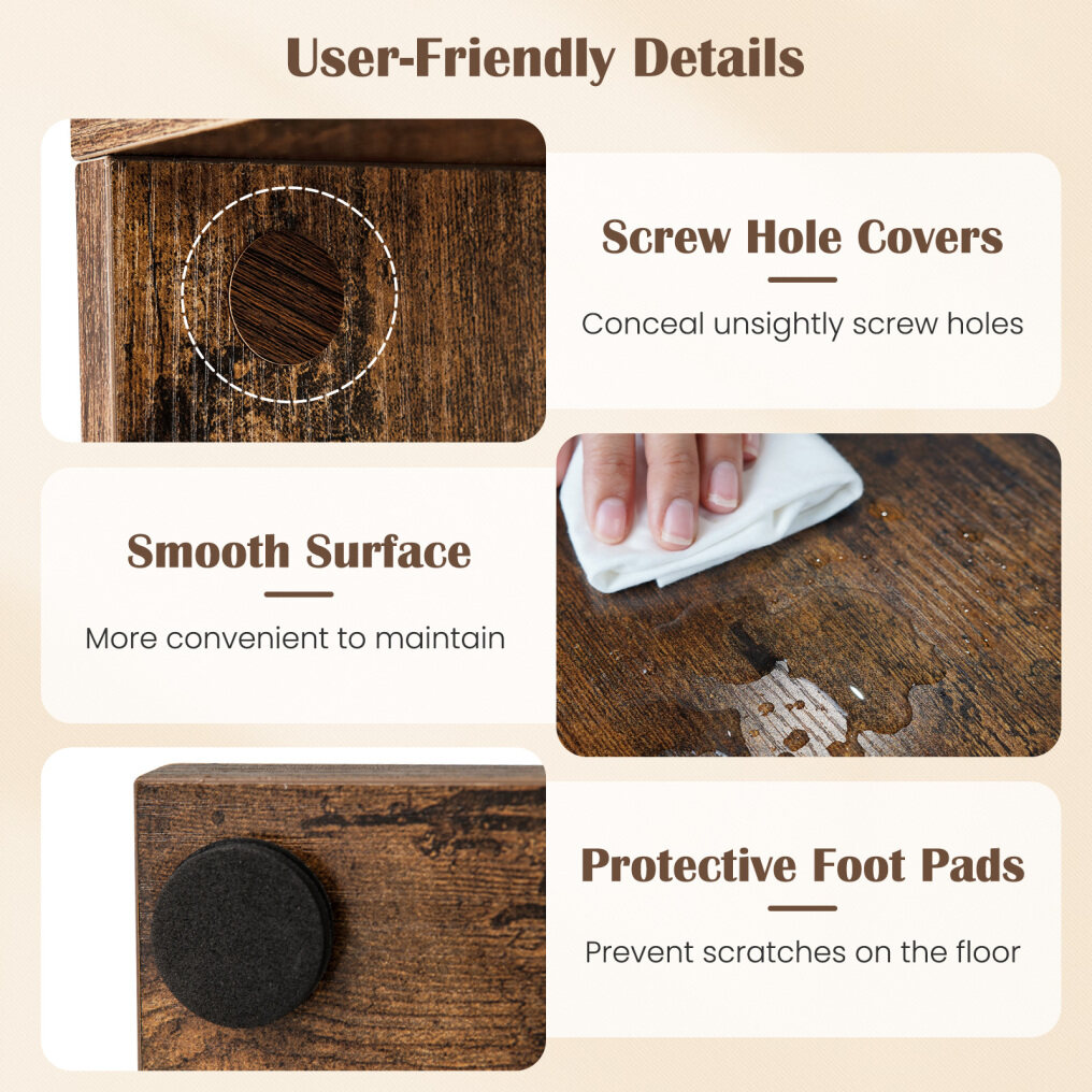 This stylish and practical bookcase offers ample storage space with its 7-tier design. It allows for geometric harmony and blends seamlessly with various decoration styles. The sturdy construction and 2 anti-tip sets ensure safety, while protective foot pads prevent scratches on the floor. The smooth surface and screw hole covers ensure easy cleaning and provide a uniform appearance. This versatile and functional bookcase is the ideal choice for your living room, bedroom, study, etc. More user-friendly details are waiting for you to discover.
