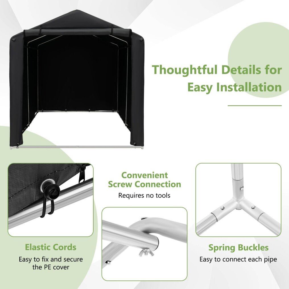 ● Roll-up Zippered Door: The large door of the shed is equipped with double-sided zippers, allowing for convenient entry and exit from both inside and outside. This feature ensures easy accessibility to your stored items. Besides, the door can be rolled up to promote ventilation, thus keeping your items dry.