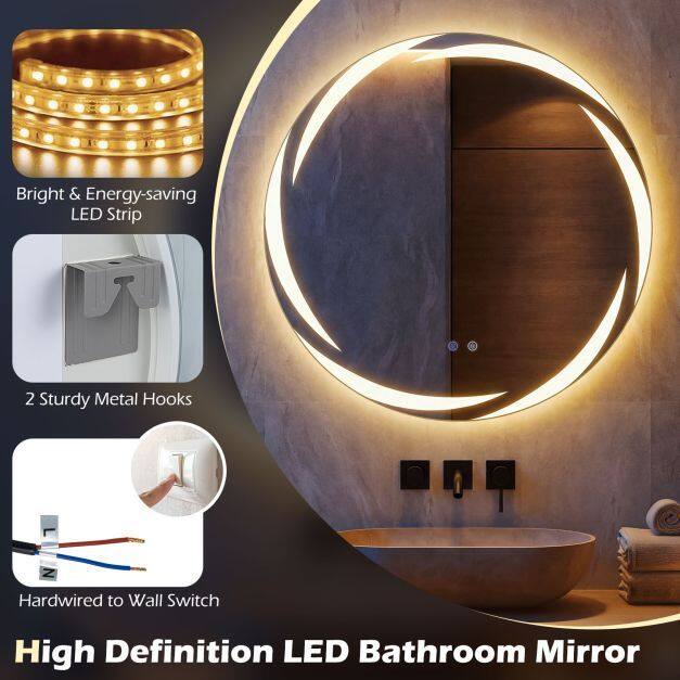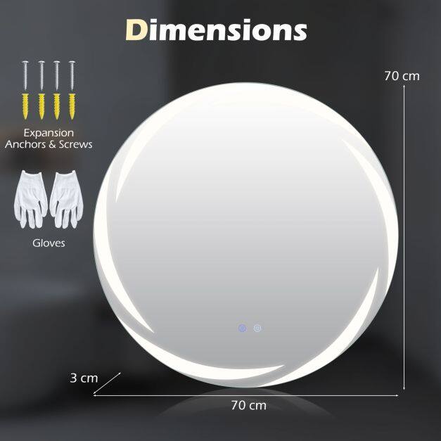 Enjoy the ultimate grooming experience with this LED bathroom mirror. This wall-mounted mirror offers customizable lighting options thanks to a stepless dimmer and three color temperature modes, accessible with a short press to change the color and a long press to adjust the brightness. The smart memory function retains your preferred brightness and color temperature. Additionally, this illuminated vanity mirror includes a one-touch anti-fog function. Installation is simple with the two metal hooks and included hardware.