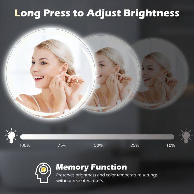 【Customizable Lighting Experience】This LED bathroom mirror offers stepless brightness adjustment with 3 adjustable color temperatures: cool light, natural light, and warm light. Furthermore, the memory function easily recalls your preferred settings for each use.