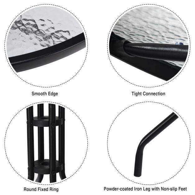 Sturdy and Unique Metal Frame: Designed with a slightly curved leg structure and made of quality iron, the patio table is steady enough to hold weight up to 50kg. What’s more, the powder-coated black finish makes it rust-prof and durable for long-lasting performance. The 2-tier circle bar and anti-slip feet pads enhance extra stability.