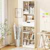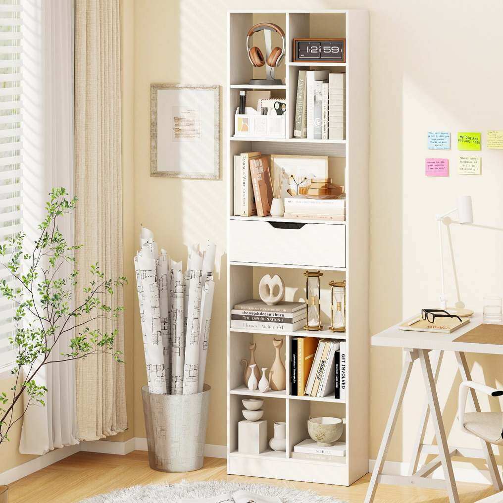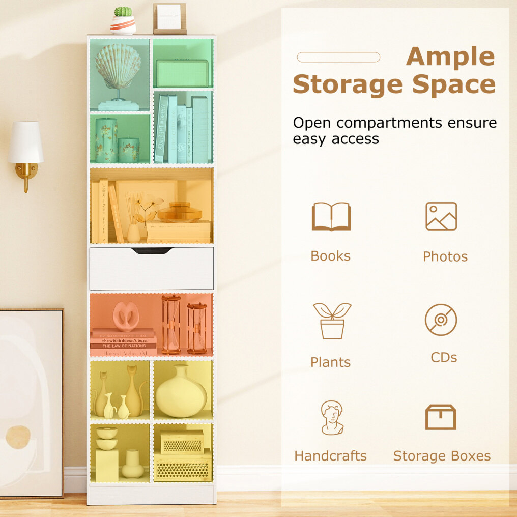 Spacious Organization: Featuring 7 open cubby compartments alongside a large drawer, this stylish bookcase offers plenty of room for organizing books, plants, and crafts while conserving your floor space. The blend of open and concealed storage fits various needs seamlessly.