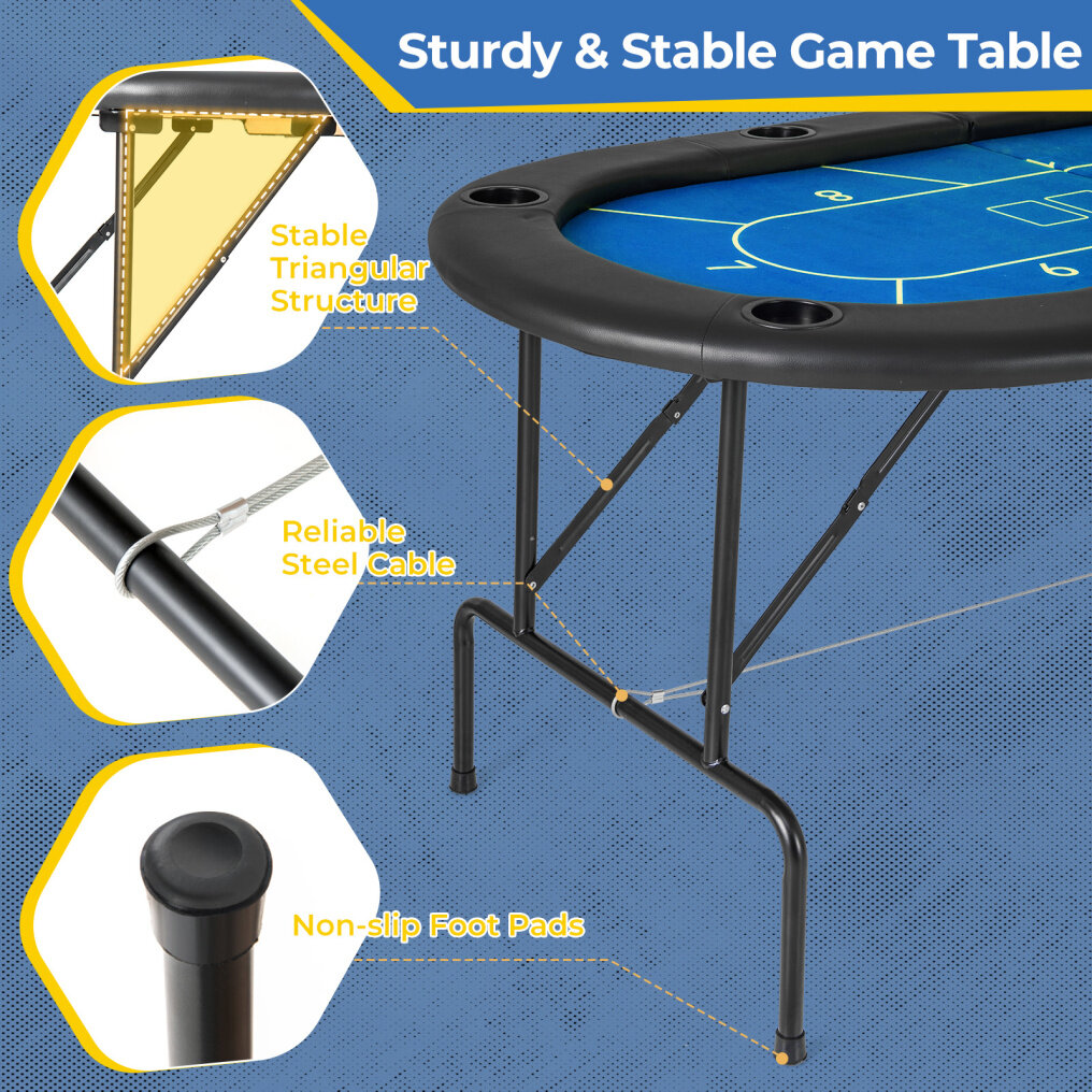 ● 8 Built-in Cup Holders: Equipped with 8 built-in cup holders, this foldable game table keeps your beverages secure and within arm's reach. The 3" enlarged holders are designed for different glasses and beverages, ensuring that your drinks stay put even during the most intense rounds of poker or blackjack.
