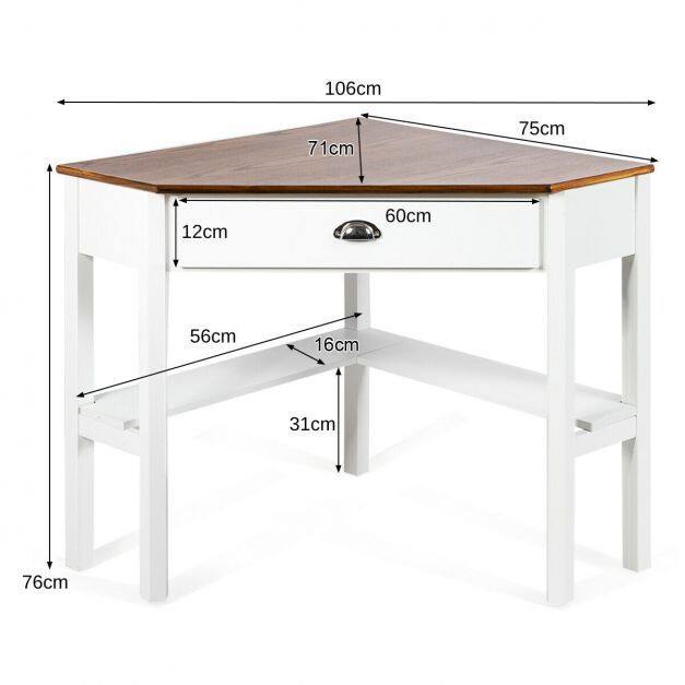This is our brand-new corner computer desk, which combines an elegant appearance and multiple functions. The corner table is considerately designed with a large drawer and two wide shelves to offer you plenty of room for a computer, laptop, table lamp, book, and other items. This unique corner table improves space utilization while also making your room organized and tidy. Combining simple lines and vivid colours, this modern corner table will add elegance to your room, blending perfectly with other decoration styles you have in your home. Solid pine wood structure ensures the firmness of the table, ensuring your long-term service life. Whether for home or commercial use, this corner table is a perfect choice for you. Order one now!