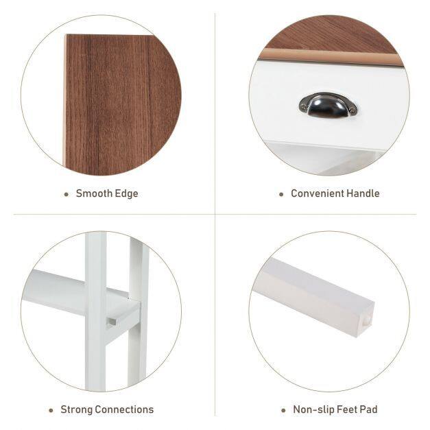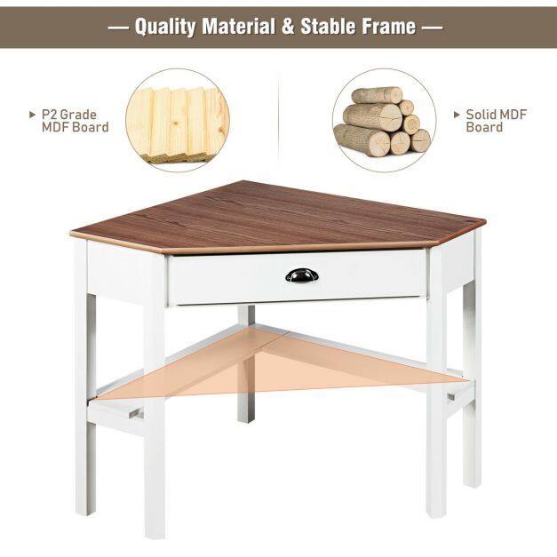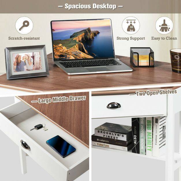 Large Storage Space: This corner table is designed with a spacious desktop, a delicate drawer and two open shelves for you to place plenty of items. Sufficient storage space allows you to place your frequently used items within arm's reach. Besides, equipped with a handle, you can easily take things out of the drawer and put them back in.