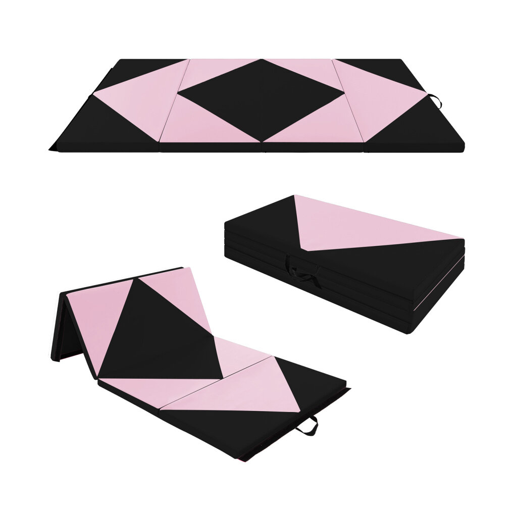 ● Foldable and Portable Design: This tumbling mat is designed with a four-fold construction and reinforced carry handles, which allows for easy storage and transport. Product dimension: 8' x 4' x 2" (L x W x H). Folded dimension: 4' x 2' x 8" (L x W x H).