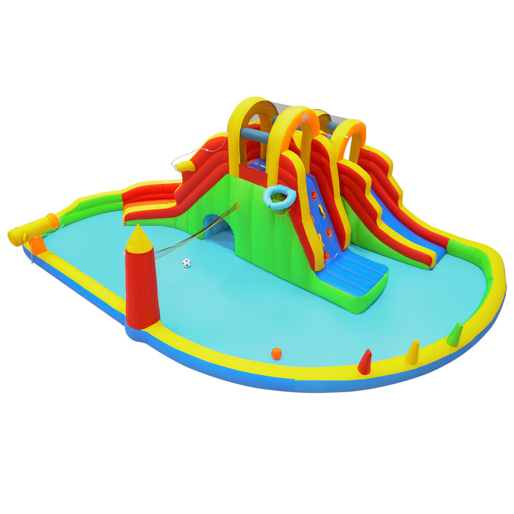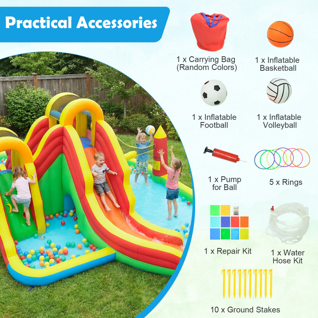 ● Practical Accessories: The convenient carrying bag, a repair kit, a water hose, 5 rings, 10 ground stakes, a basketball, a football, a volleyball and a hand pump ensure easy setup and hours of enjoyment. (Note: ideal for kids from 3 to 12 years old under 100 lbs, max. weight on inflatable part: 200 lbs)