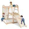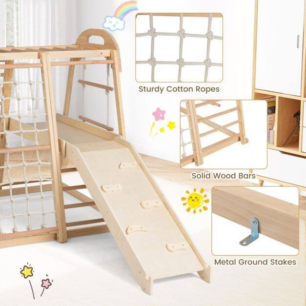 8-in-1 Playground: This wooden climber playset offers 8 ways to play, including monkey bars, swing, climbing net, climbing ladders, resting platform, climbing rock, slide and rope ladder. Its versatile design will keep little explorers engaged and entertained.