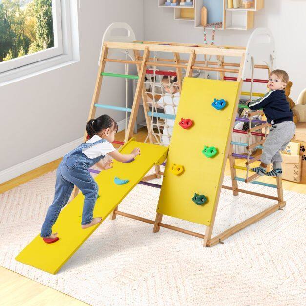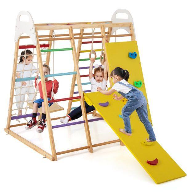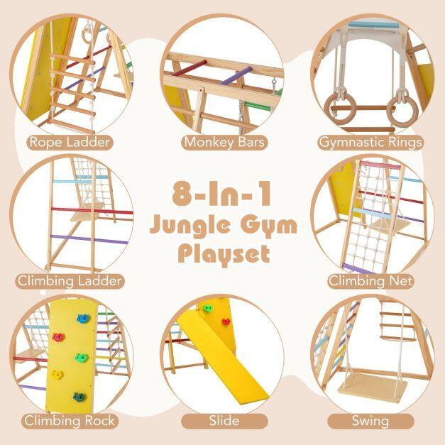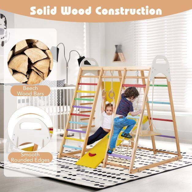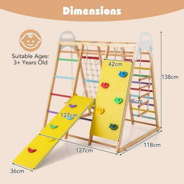 ● 8 in 1 Multifunctional Playset: This indoor playground features a slide, climbing rock, climbing ladder, climbing net, rope ladder, monkey bars, wooden swing, and gymnastic rings, offering endless active fun. The large play area accommodates up to 4-5 children, providing ample space for multiple kids to play together.