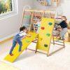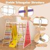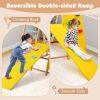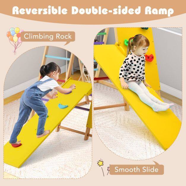 ● Versatile Reversible Ramp: The wooden climber playset is designed with a reversible double-sided ramp that easily switches between a smooth slide and a climbing ramp with rocks, adding versatility and encouraging both sliding and climbing during playtime. This design enhances functionality and saves space.