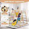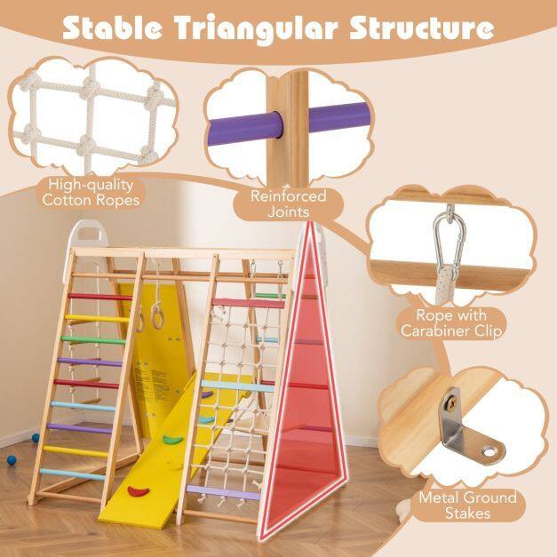 ● Solid Wood Construction: Crafted from solid beech wood bars with smooth, splinter-free surface, this climbing toy play set ensures durability and safety. The stable triangular structure, reinforced joints, and metal ground stakes enhance overall stability. The playset Applies with ASTM and CPSIA for safe use.