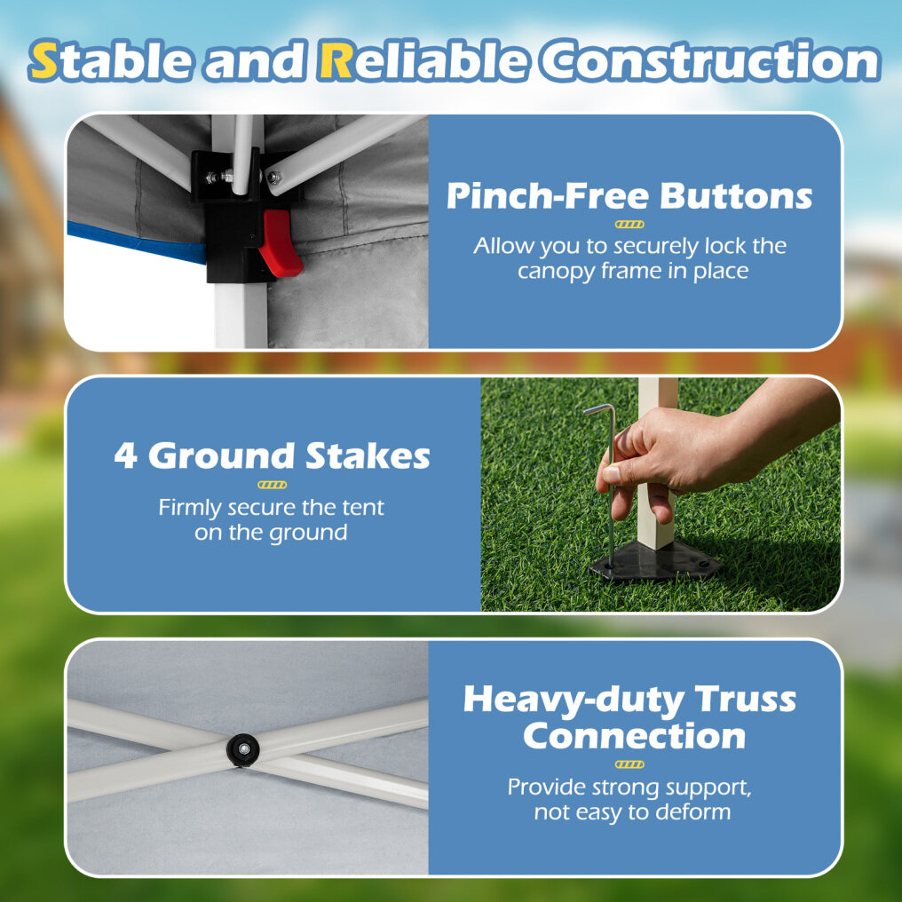 ● Easy Setup, No Tools Required: This outdoor gazebo is equipped with a hassle-free pop-up structure, making installation a breeze, and no tools required. Simply expand the frame via pinch-free buttons and secure the canopy via hook and loop fasteners.