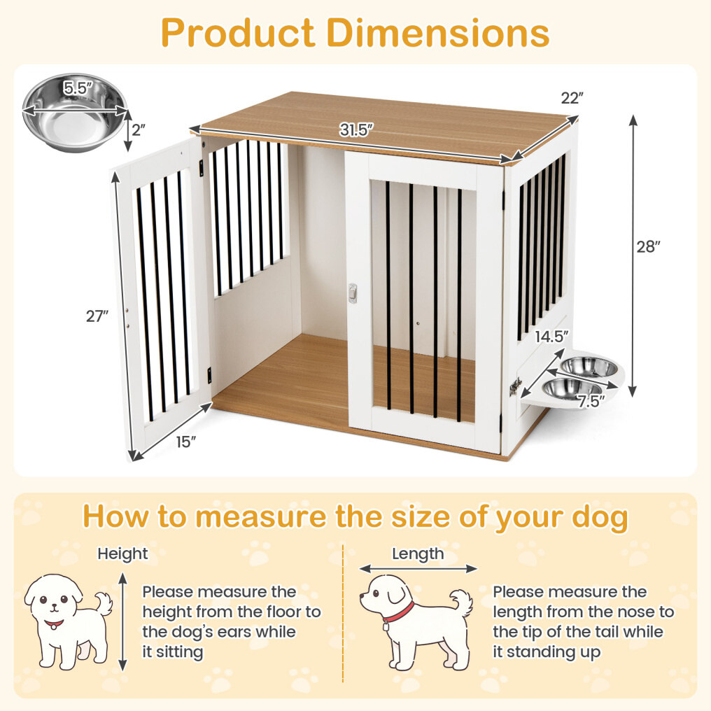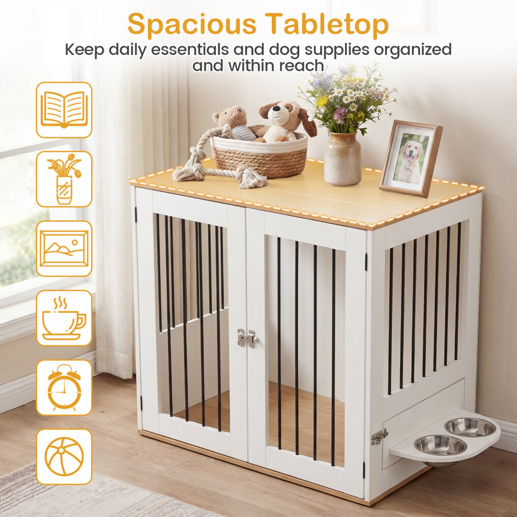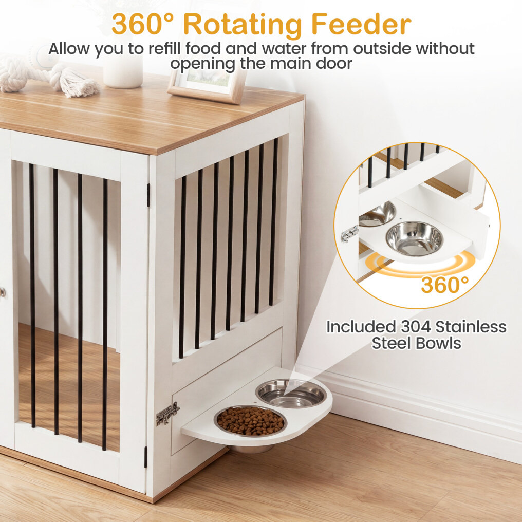 This dog crate is thoughtfully designed to offer both dependable security and furniture-style elegance. More than just a kennel, it serves as a decorative addition to your home. Constructed with sturdy wooden panels and reinforced metal bars, it provides a stable enclosure for your dog. The lockable front doors enhance safety, while the 360° rotating feeder allows convenient meal service from outside the crate. Stainless steel bowls are easy to remove and clean, ensuring convenient daily feeding. In addition, with its clean design, this dog kennel fits naturally into a living room, bedroom, or entryway while giving your pet a secure and comfortable retreat.