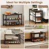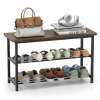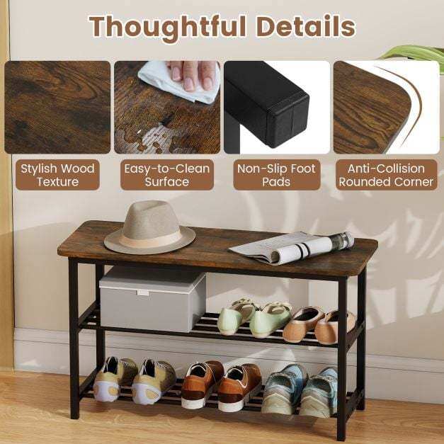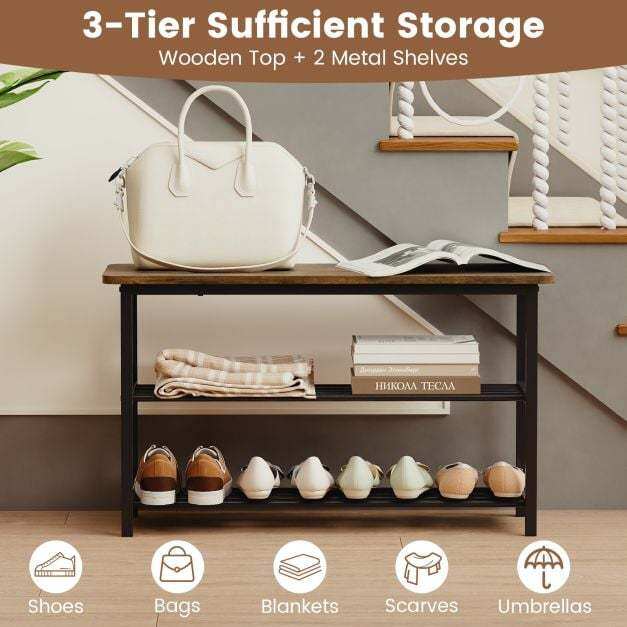 This shoe rack offers 3-tier sufficient storage with a 80 cm wooden top and 2 metal shelves to neatly organize shoes, bags, and more. Its heavy-duty metal frame provides robust support with a 135 kg weight capacity, ensuring a reliable seat for changing footwear. Designed for flexibility, the shoe organizer fits seamlessly in entryways, living rooms, or bedrooms. The rustic wooden seat boasts a stylish wood texture and an easy-to-clean surface. Equipped with non-slip foot pads and rounded corners, it protects floors and enhances safety. This appealing and functional shoe bench with thoughtful details will create a clutter-free, welcoming home environment for you.