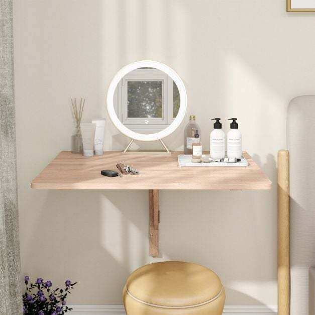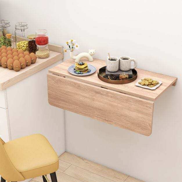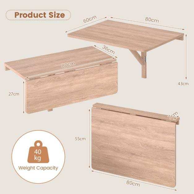 Featuring a wall-mounted and foldable design, our desk offers an ideal space-saving solution for those who have limited living space. The 80 x 60 cm desktop is large enough for you to place a laptop, a few books, snacks, a potted plant, etc. With a double folding design, you can fold half of the countertop and place a small amount of items. Besides, when you don't need to use the desk, you can fold down the desktop completely to save space. Crafted from premium MDF and solid pine wood, the folding desk is stable, durable and can withstand great load. The sturdy wooden bracket in triangular structure enhances overall stability. It is great for you to enjoy reading books, surfing the internet with your laptop or enjoying coffee or breakfast with this versatile folding table. Moreover, this modern drop-leaf table with a simple design will add a stylish feel to your home.