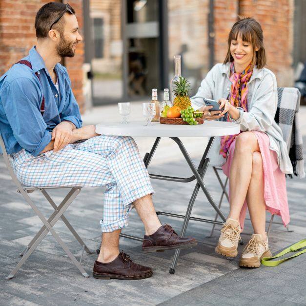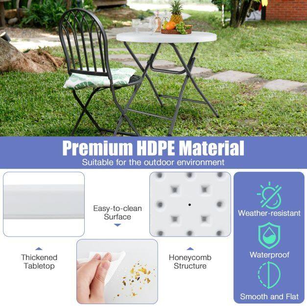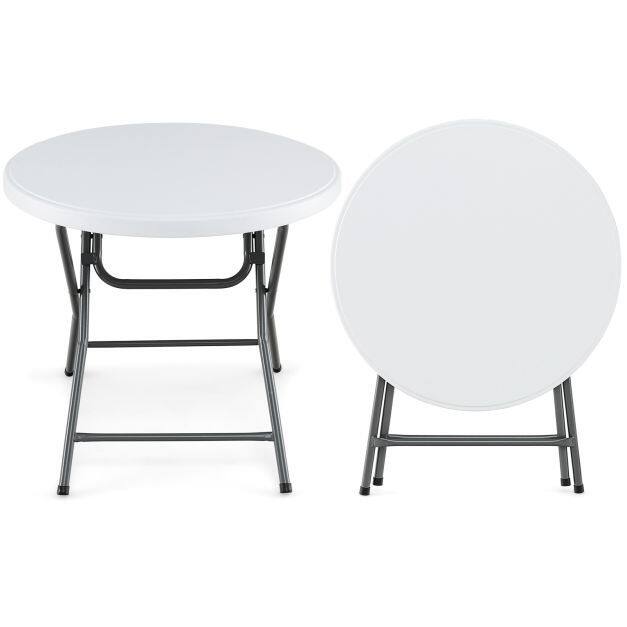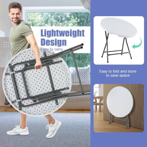 Upgrade your dining experience with the folding dining table. Constructed with weather-resistant HDPE, the round table can be used for a long time, especially perfect for outdoor use. Besides, reinforced by heavy-duty metal legs and a honeycomb structure on the back of the tabletop, this folding table is a reliable choice for various occasions, while the non-slip foot pads ensure stability on uneven ground. More importantly, the folding design allows for easy storage and carrying, making the plastic table ideal for picnics, weddings, camping trips, garden gatherings, and everyday use at home. Lastly, this outdoor dining table has no installation required, and the maintenance is also a breeze!