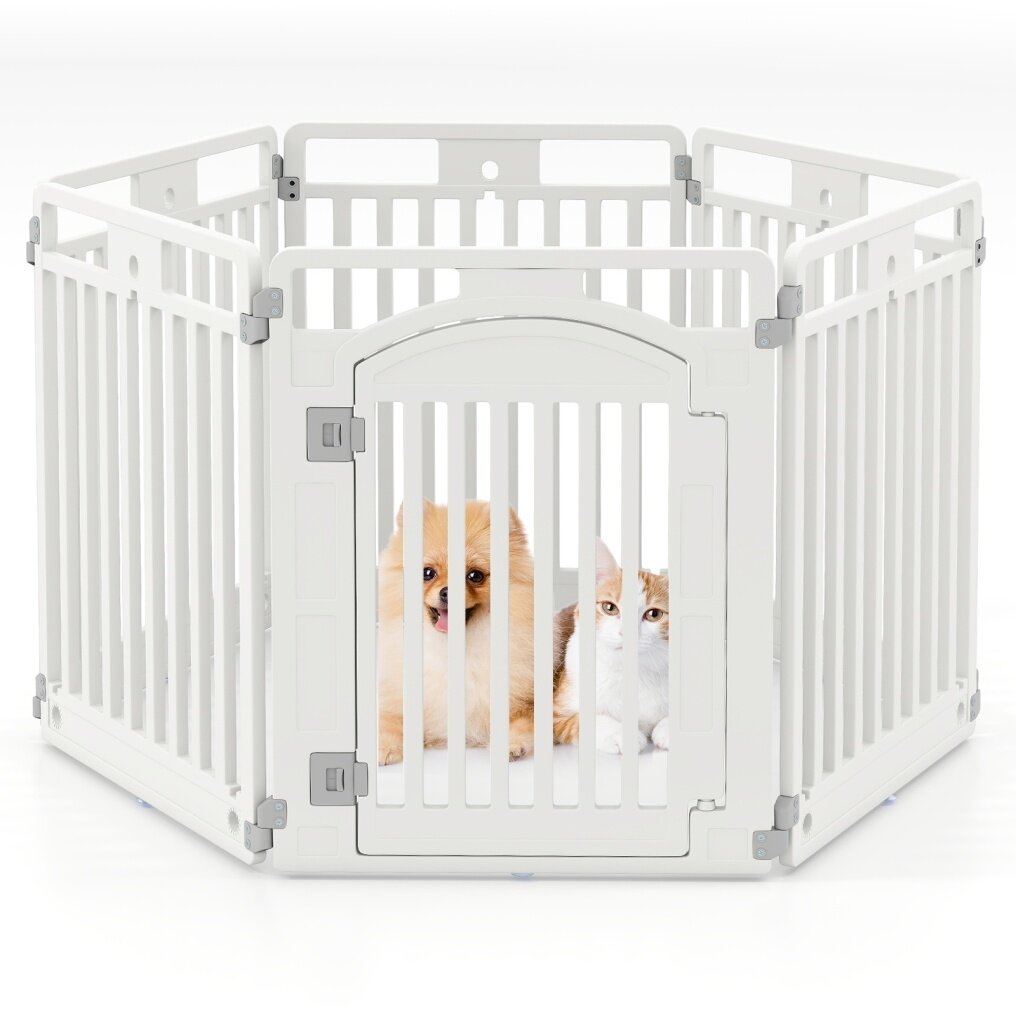The adaptable pet playpen can transform into a playpen or fence, perfect for small to medium-sized dogs with its 6 81cm high panels. Crafted from HDPE, the pet fence is all-weather, enduring, and easy to maintain. Moreover, it includes a secure lockable door for added safety. Suitable for both indoor and outdoor use, it features suction cups and ground stakes for stability. Easily collapsible for portability and storage, this playpen is ideal for homes with limited space. Thanks to its tool-free assembly with interlocking connections, setting up this portable dog playpen is easy and quick.