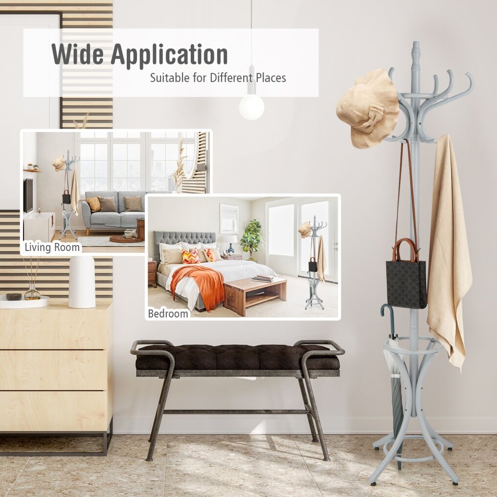 Large Space for Storage: This clothes rack has 12 hooks so that you can hang clothes, pants, hats or bowls on it. In addition, this clothes rack also has an umbrella stand, so it offers you rich storage space for an umbrella when you use it. Classic & Elegant