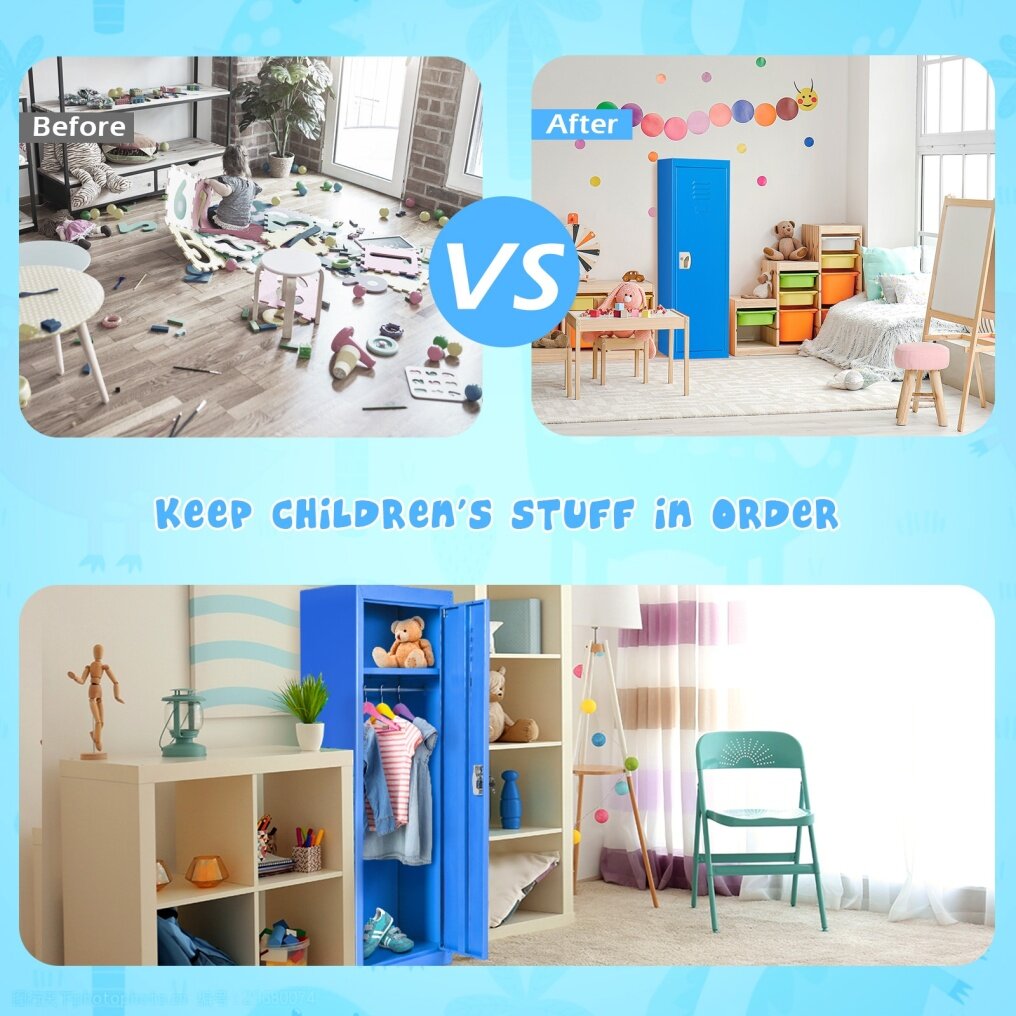 Large Storage Space: With a shelf inside, the 122cm high locker cabinet boasts a 2-tier large storage space for kid's schoolwork, backpacks, sports gear, toys, etc. The hanging rod helps to hold their clothes without wrinkling. Roomy storage space is enough for kids to keep their items well organized, helping them develop good habits.