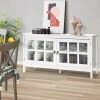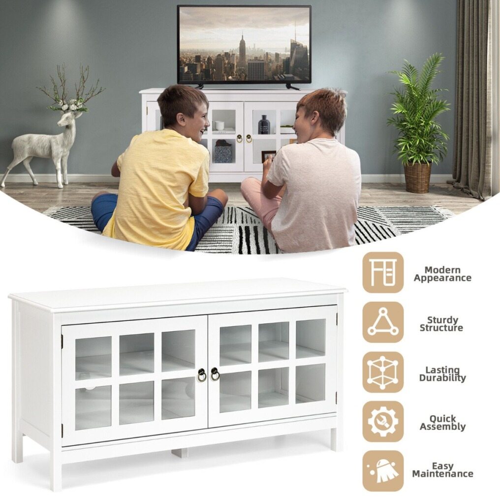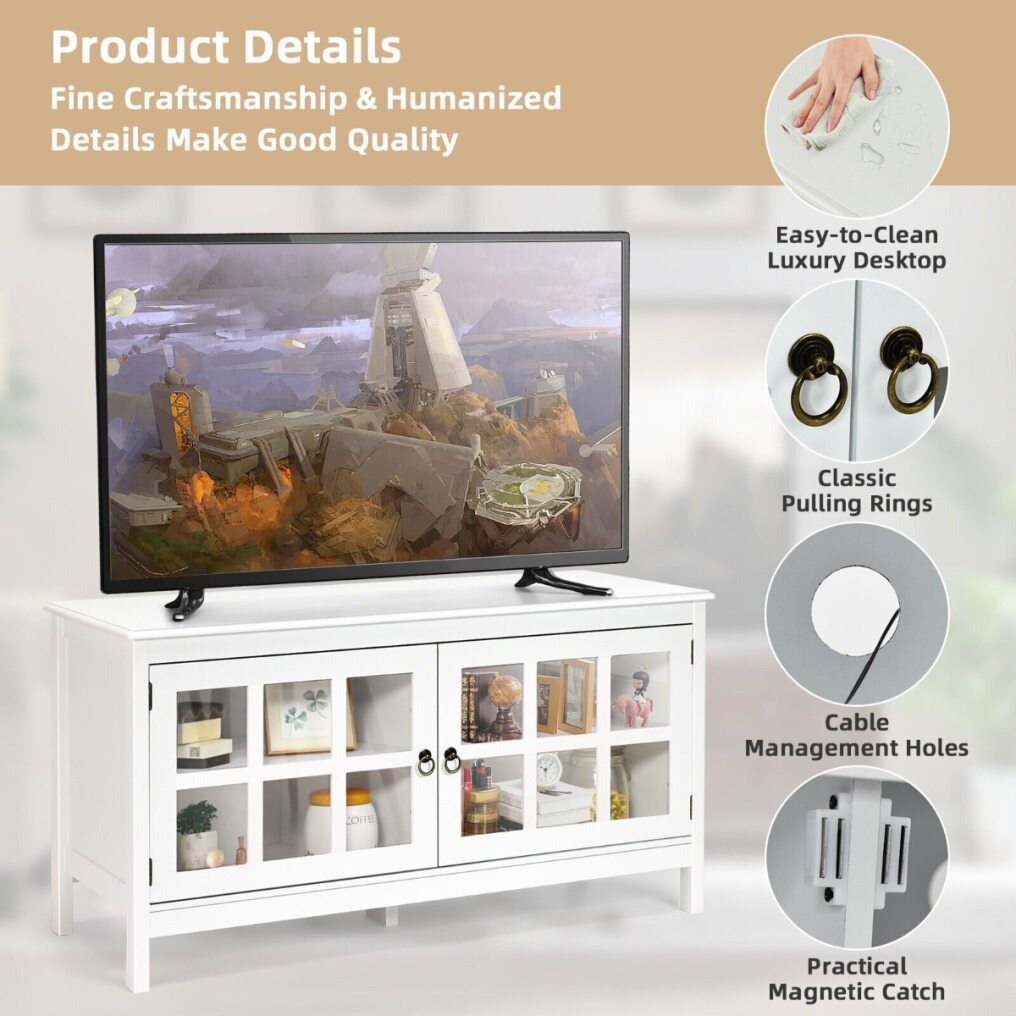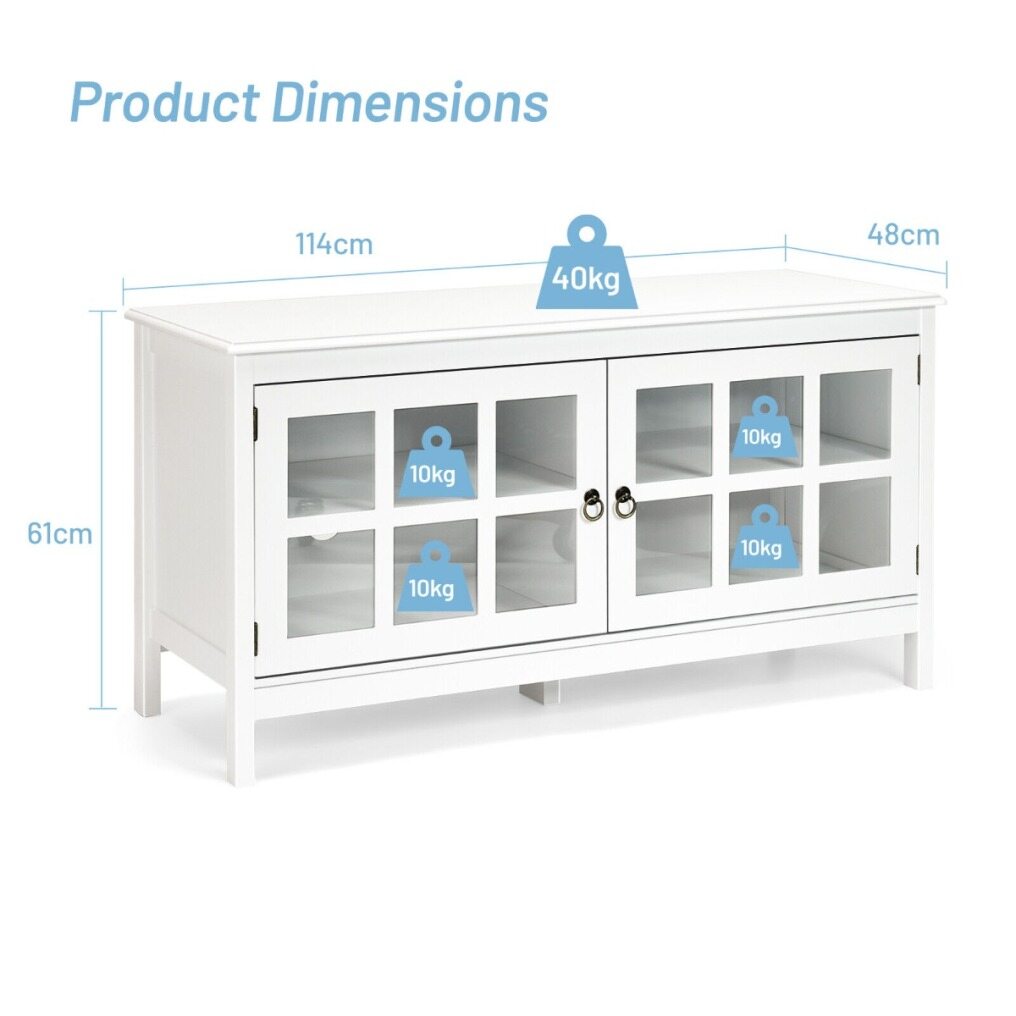 Are you looking for a practical TV stand to enhance your entertainment centre in an organized way? This modern TV console table combines style, function and comfort to meet your needs. Crafted from durable particle board and MDF board, this TV console ensures long years to use and is easy to clean. With a 45” x 19” top, the table is large and wide enough to accommodate TVs up to 50'’. This storage cabinet with adjustable shelves provides ample storage space for your daily essentials behind double doors with tempered safety glass panes. And its cable management system helps you maintain a tidy entertaining space to enjoy your favourite movies and games. This modern console table fits any home decor with function and aesthetics, and can be widely used as a hallway table, entertainment centre, media stand, storage console table, etc. Add it to your cart and give your TV the perfect perch with this media stand!