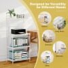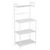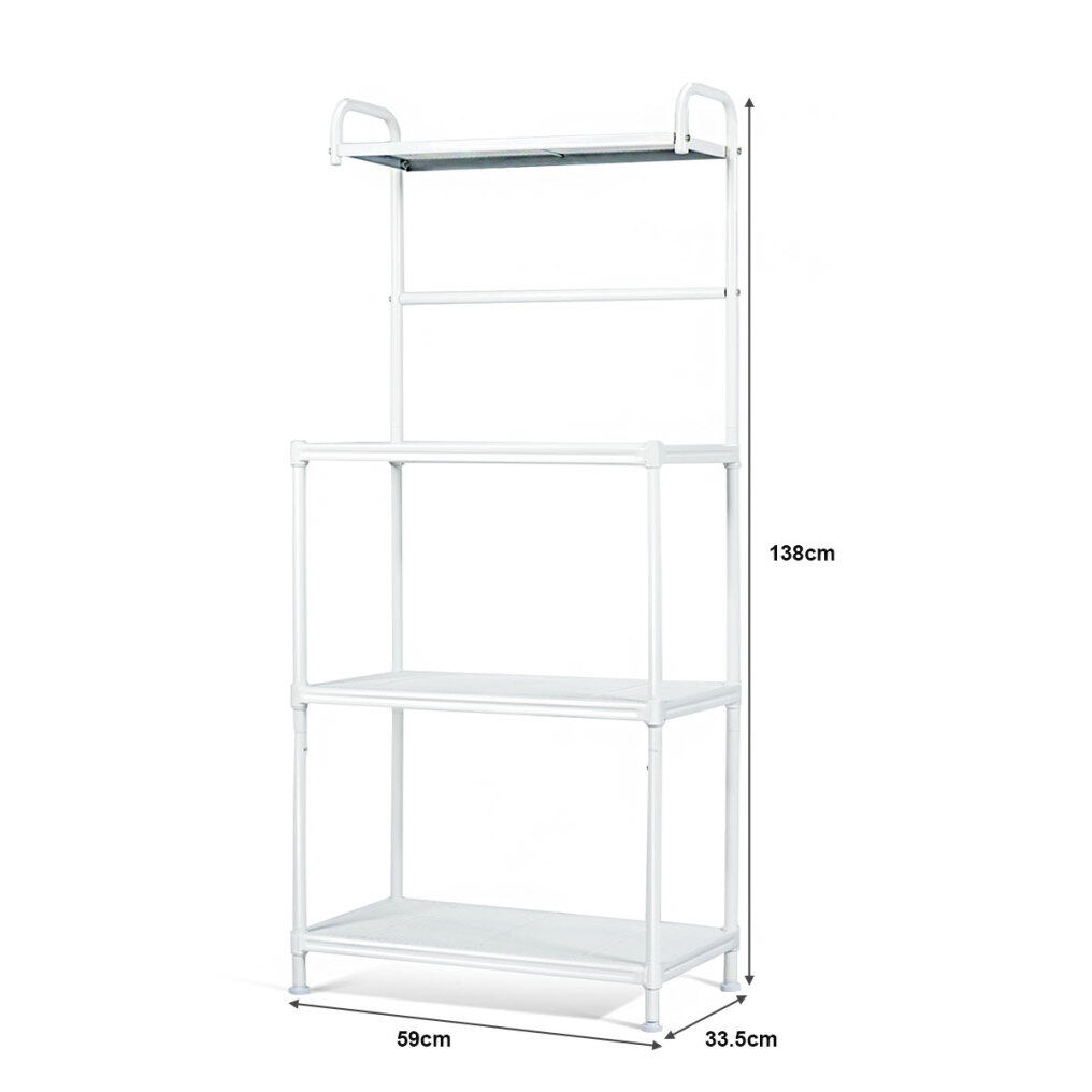 4-Tier Multipurpose Shelf: This kitchen utility shelf has massive space to hold a microwave, toasters, dishes, spices, and other kitchen appliances. 4-Tier shelf can also be used in other areas, such as the living room, home office and entryway, to help you organize shoe boxes, handbags or books. Classifying items orderly on each open layer, you will find what you want quickly.