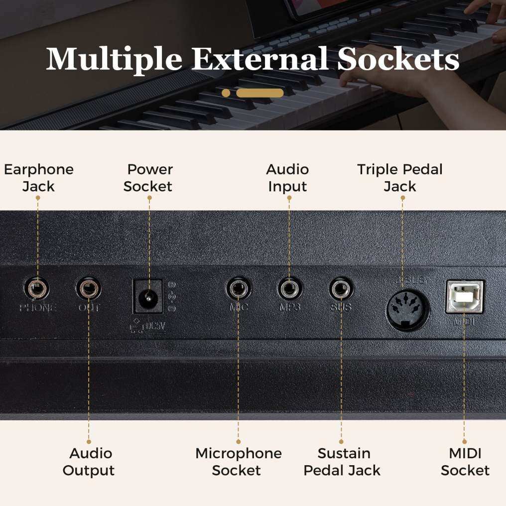 MIDI Connection & Sockets: The digital piano can support MIDI connection to Apps like POP Piano, GarageBand, Perfect Piano, etc. Moreover, there are multiple external sockets that can be compatible with power, headphones, pedals, and other devices.