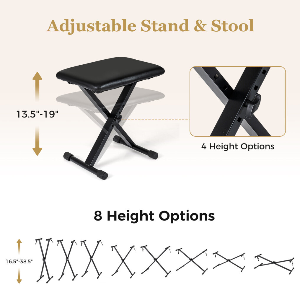 Adjustable & Portable Design: 8-level adjustable stand and 4-level adjustable stool are designed for “pianists” of different ages. The electric piano kit also comes with a portable bag for easy carrying.